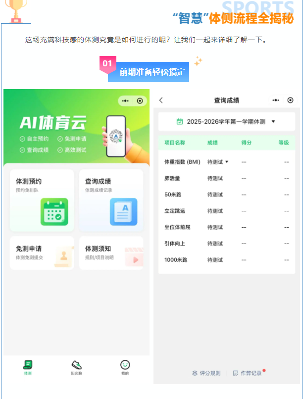 体测前,全体在校生只需通过微信小程序,登录自己的学号和姓名,就能轻松进行人脸采集。采集完成后,相关信息会直接导入智慧体育系统 。不仅如此,同学们还能在小程序上自助预约体测时间,再也不用像以前那样,为了体测时间安排而烦恼,大大简化了前期准备流程,让体测更加有条不紊。