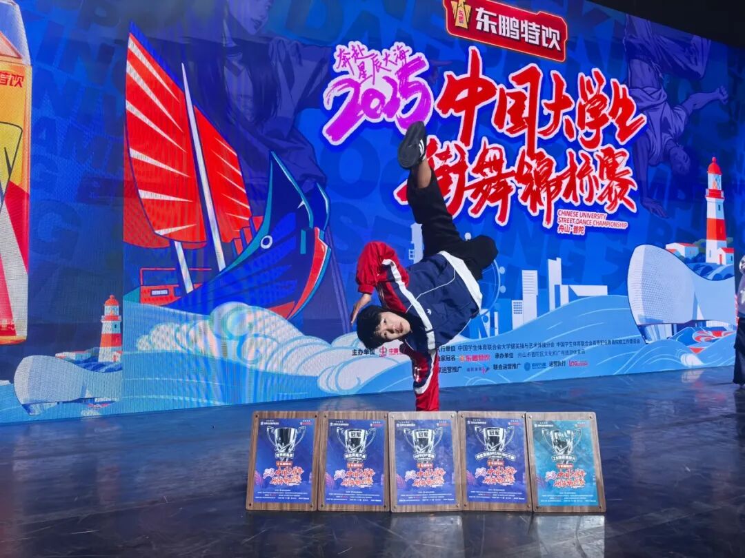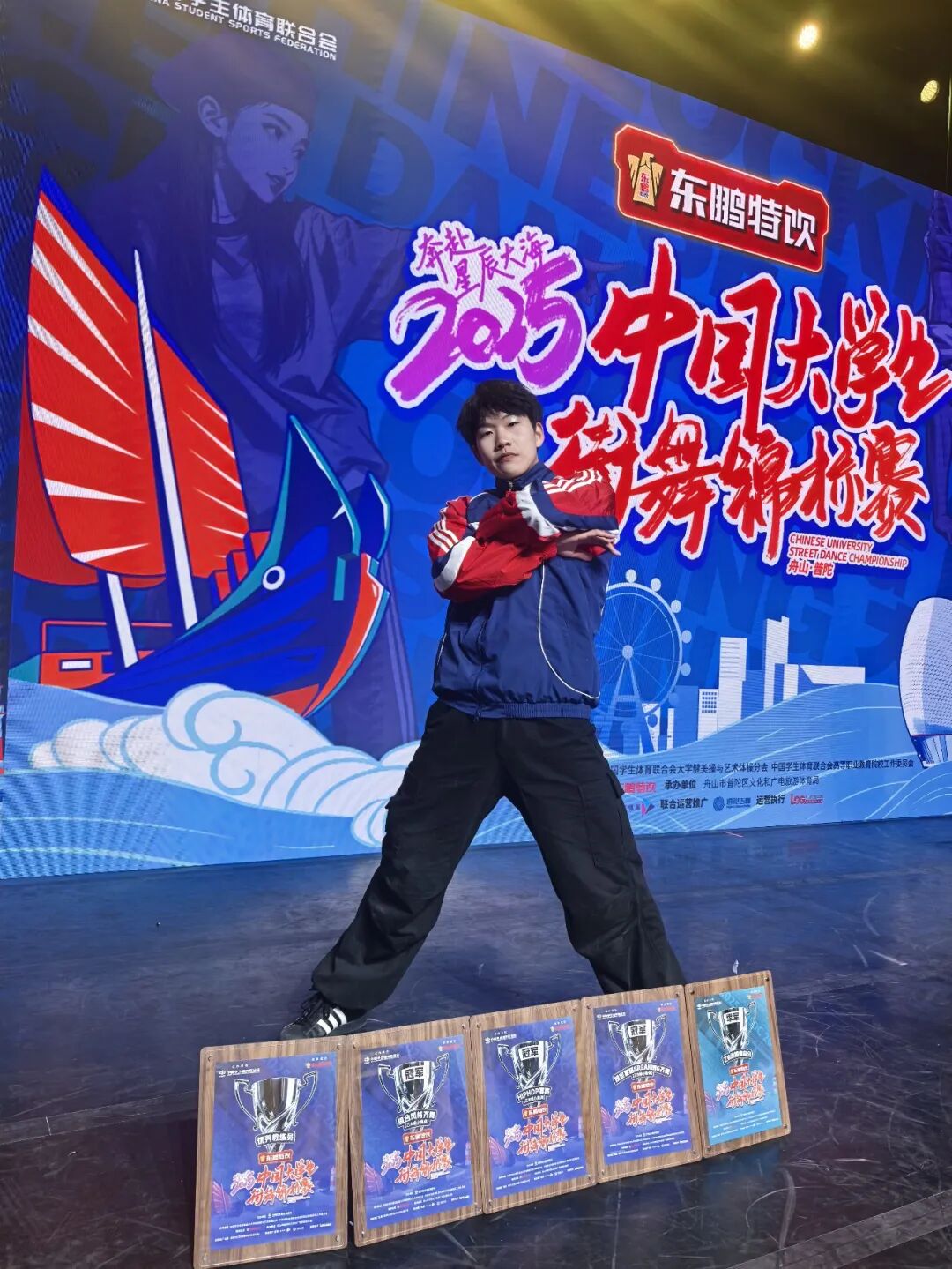 大二上学期,经过一年半的积累与沉淀,我得以入选全国老员工街舞锦标赛参赛队伍。为实现自我突破,我主动拓展舞种边界。街舞指导老师耐心帮我纠正发力误区,引导我深入挖掘非遗元素的创新应用,还鼓励我将过往赛场经历融入编舞创作。我反复观摩钻研顶尖舞者的视频,在老师的悉心点拨下不断优化动作细节。最终,我一举拿下三项冠军,更加坚定了“以热爱为舟,行稳致远”的信念。在此过程中,我的创意策划与团队沟通协作能力得到进一步提升,学会了在团队中高效整合各方意见,推动创意想法落地生根。