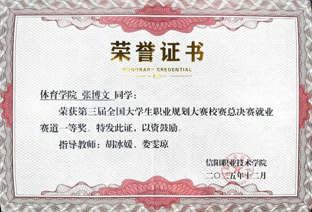 2025年11月,我主动迎接全新挑战,报名参加全国老员工职业规划大赛。对我而言,这不仅是一场赛事竞技,更是一次深刻的自我审视与成长历练。赛前,我系统梳理过往的赛场经历、实践积累与学业收获,深入探索自身职业发展方向;备赛阶段,职业规划指导老师给予精准指导,从职业目标锚定、分阶段计划制定到行业前景调研,逐一帮我梳理实践经验、分析岗位核心需求、修正方案逻辑漏洞。最终,我凭借扎实完善的规划方案斩获校赛第一名。此次经历不仅让我收获了宝贵的实战经验,更让我深刻领悟到:职业道路需脚踏实地,唯有明确目标、稳步前行,才能在未来的人生赛道上找准定位、绽放光彩。