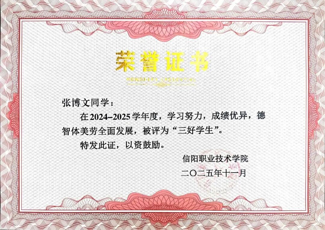 在深耕专业技能、征战各类赛场的同时,我在学业上始终丝毫不敢松懈。凭借较强的自主学习能力与高效的时间管理方法,我的成绩连续两年稳居班级第一,成功斩获公司一等奖学金与国家励志奖学金。这份荣誉让我真切体会到“一分耕耘,一分收获”的深刻内涵,更在兼顾高强度备赛与繁重学业的过程中,锤炼出扎实的时间管理、高效执行与多任务处理能力。这段历程也让我清醒认识到:优秀者更需保持谦逊精进的态度,而在学业与兴趣之间找到最佳平衡点的过程,进一步强化了我的自我驱动能力,为未来的多元发展奠定了坚实基础。